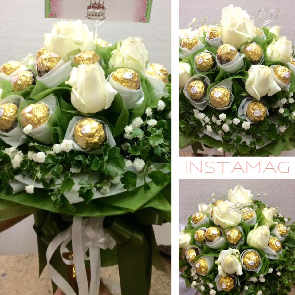 ช่อดอกกุหลาบขาวล้วน ผสมเฟอเร่โร่ แซมดอกสุ่ย