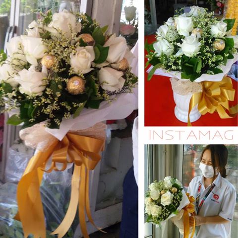ช่อดอกกุหลาบขาวผสมเฟอเร่โร่ 9 ลูก แซมดอกสุ่ย