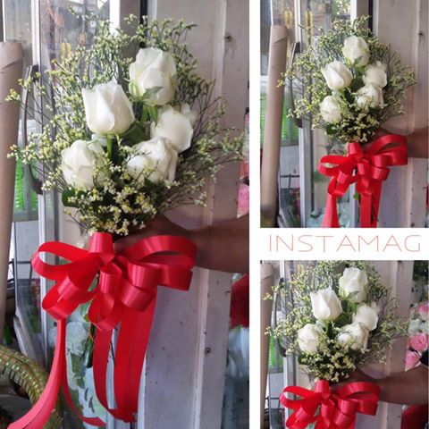 ช่อดอกกุหลาบขาว แซมด้วยดอกสุ่ย ใบผักชี