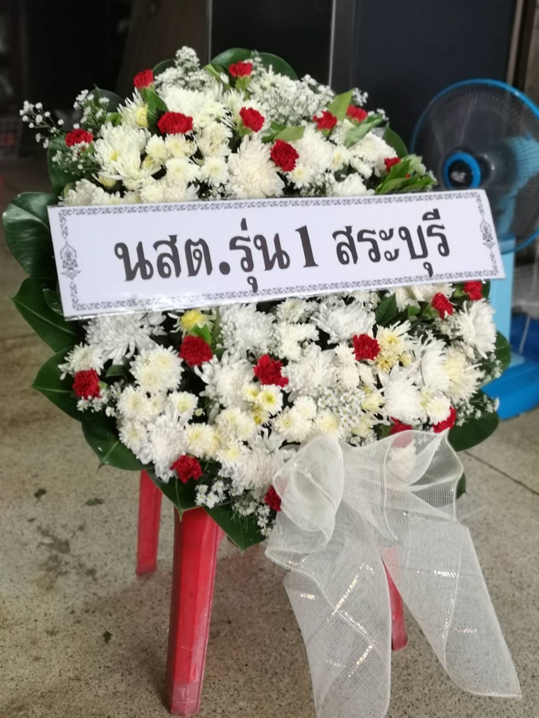 พวงหรีดพัดลมประดับดอกไม้แห้ง 1 พวง มาส่งวัดโบสถ์ (ล่าง)