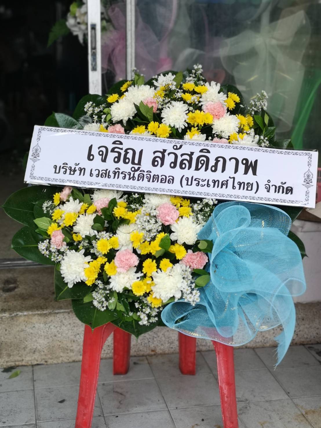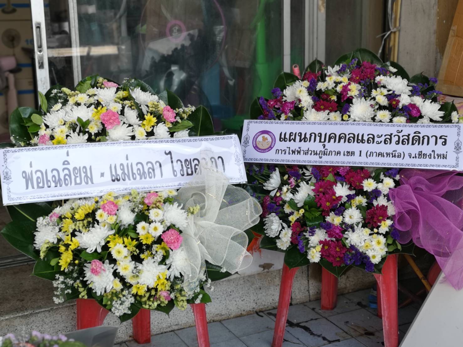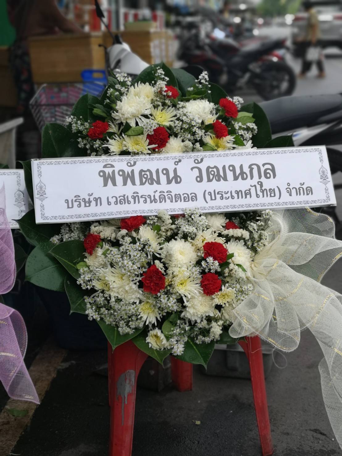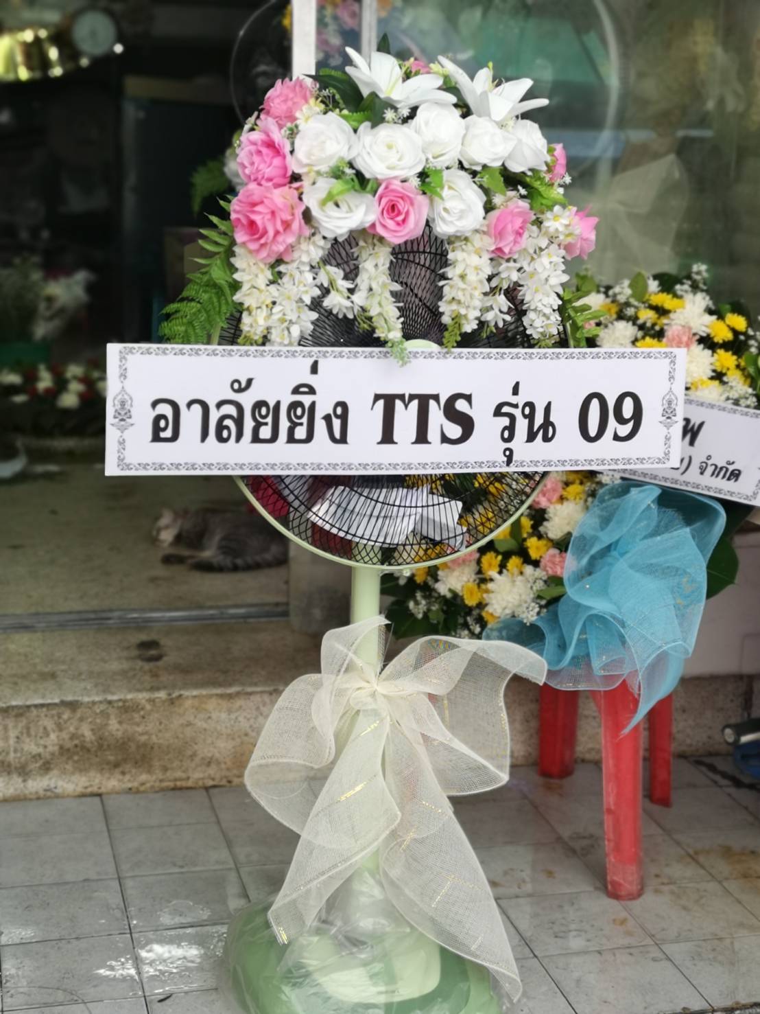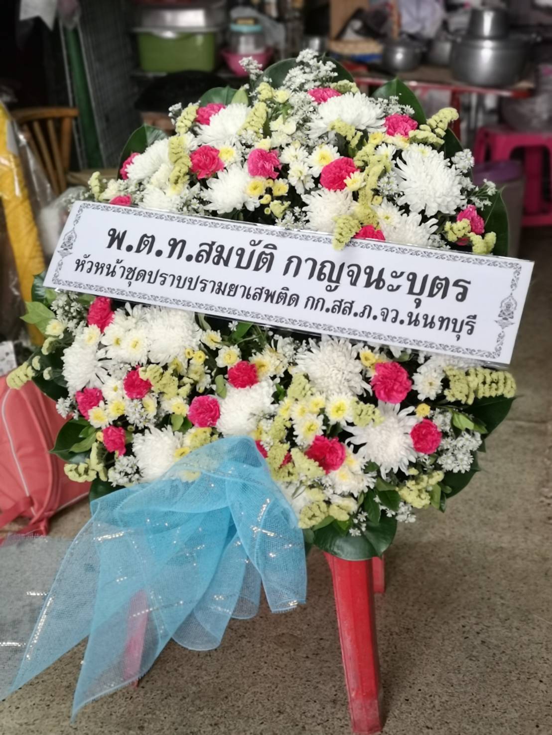 พวงหรีดดอกไม้สด ของสจ วัันชัย นายกปราสาททอง 1 พวง มาส่งวัดเสนาสนารามราชวรวิหาร ศาลา8