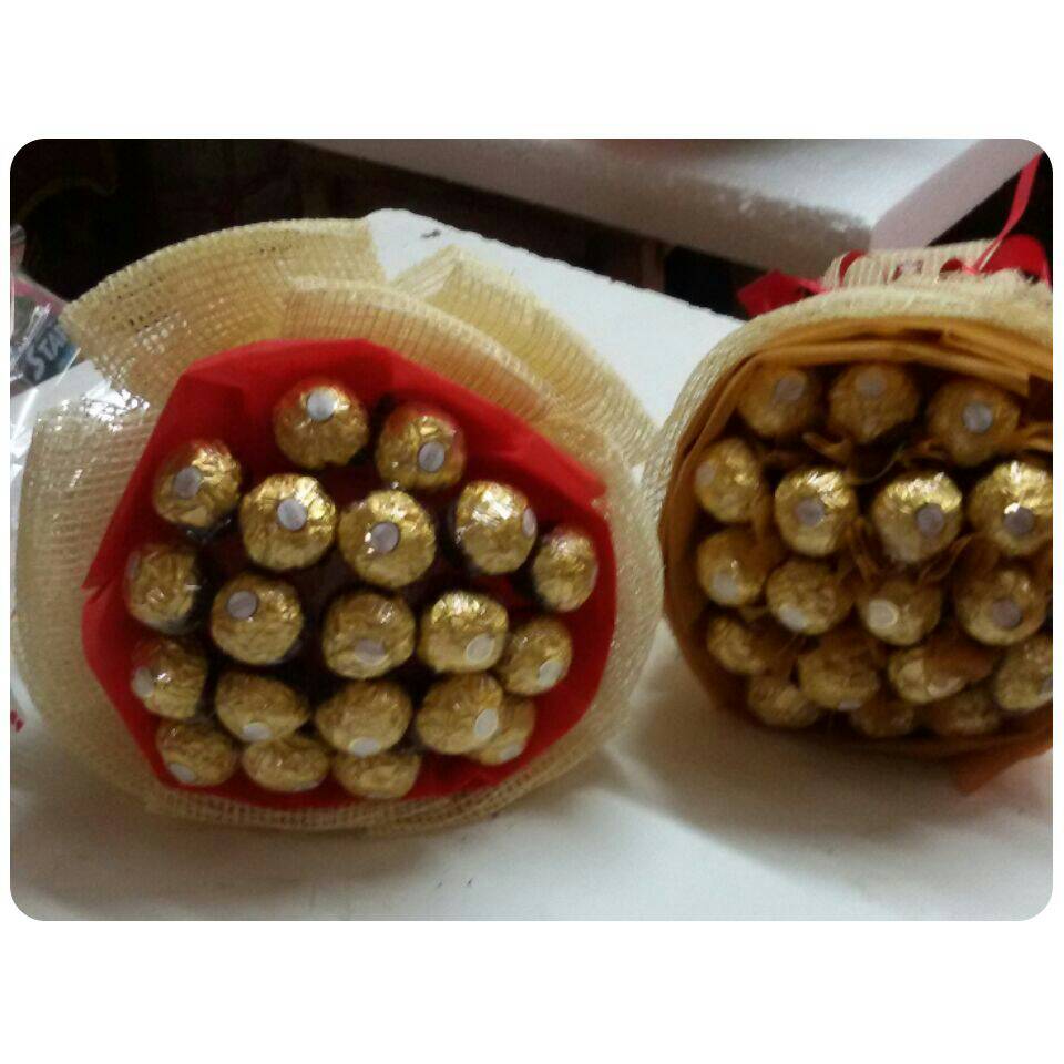 ช่อเฟอเรโร่คู่กับดอกกุหลาบสีแดง ชั่งเข้ากันจริงๆ สีสันสดใส ส่งที่นิคมบางปะอินจ้า